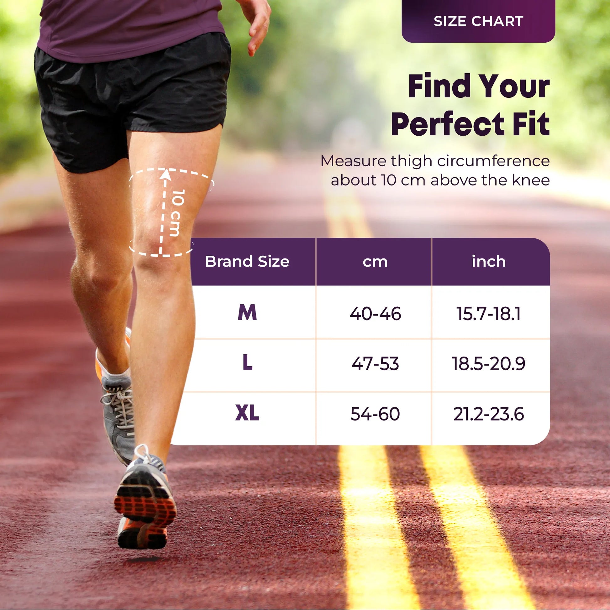 Measure the circumference of your thigh just above the knee and refer to the size chart (M: 16.5"-18.8", L: 18.8"-21.2", XL: 21.2"-23.6"). Select the size that matches your measurement for optimal compression and comfort.