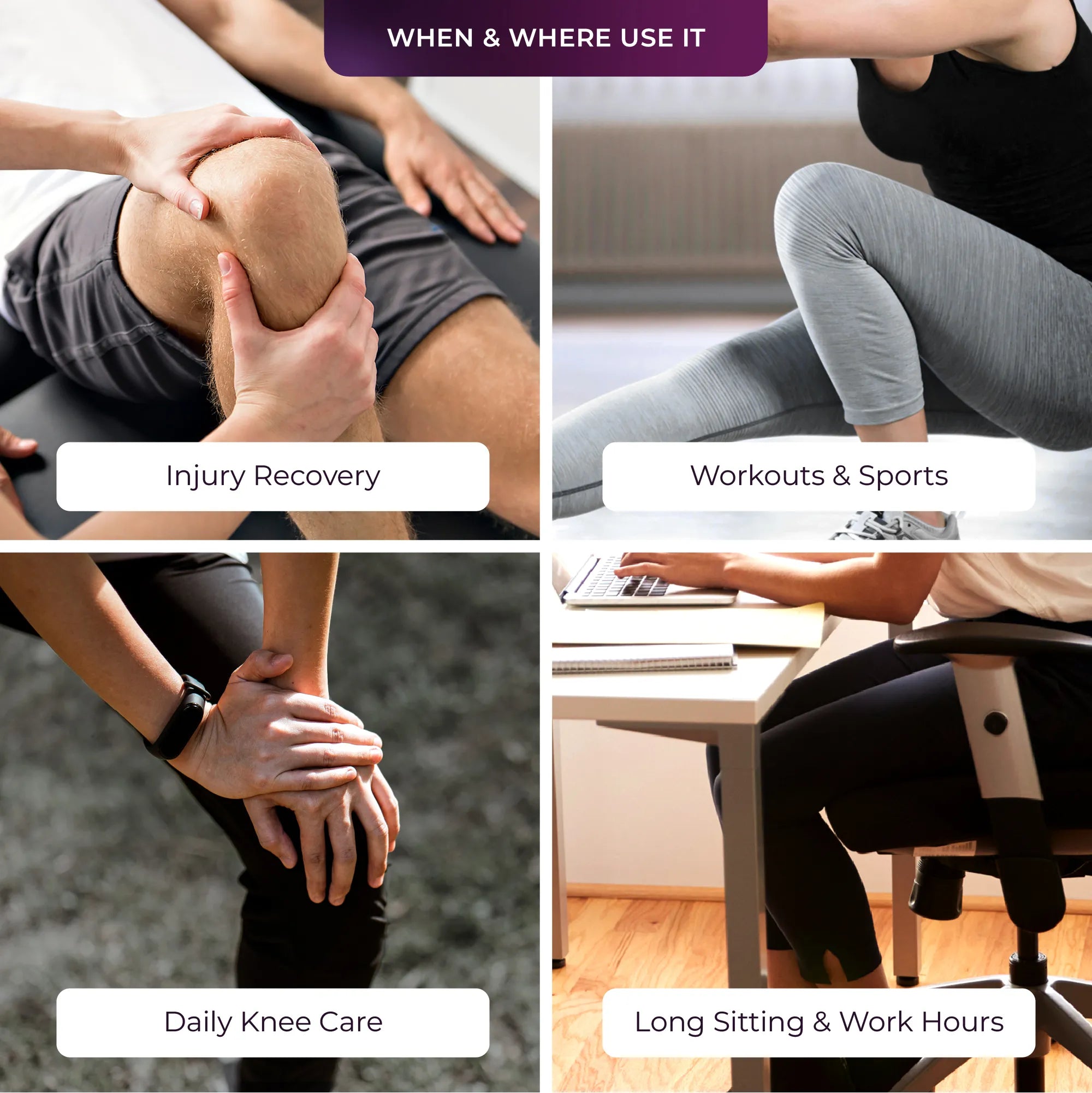 Supports knees during long sitting, standing, or walking hours at home, office, or outdoors.