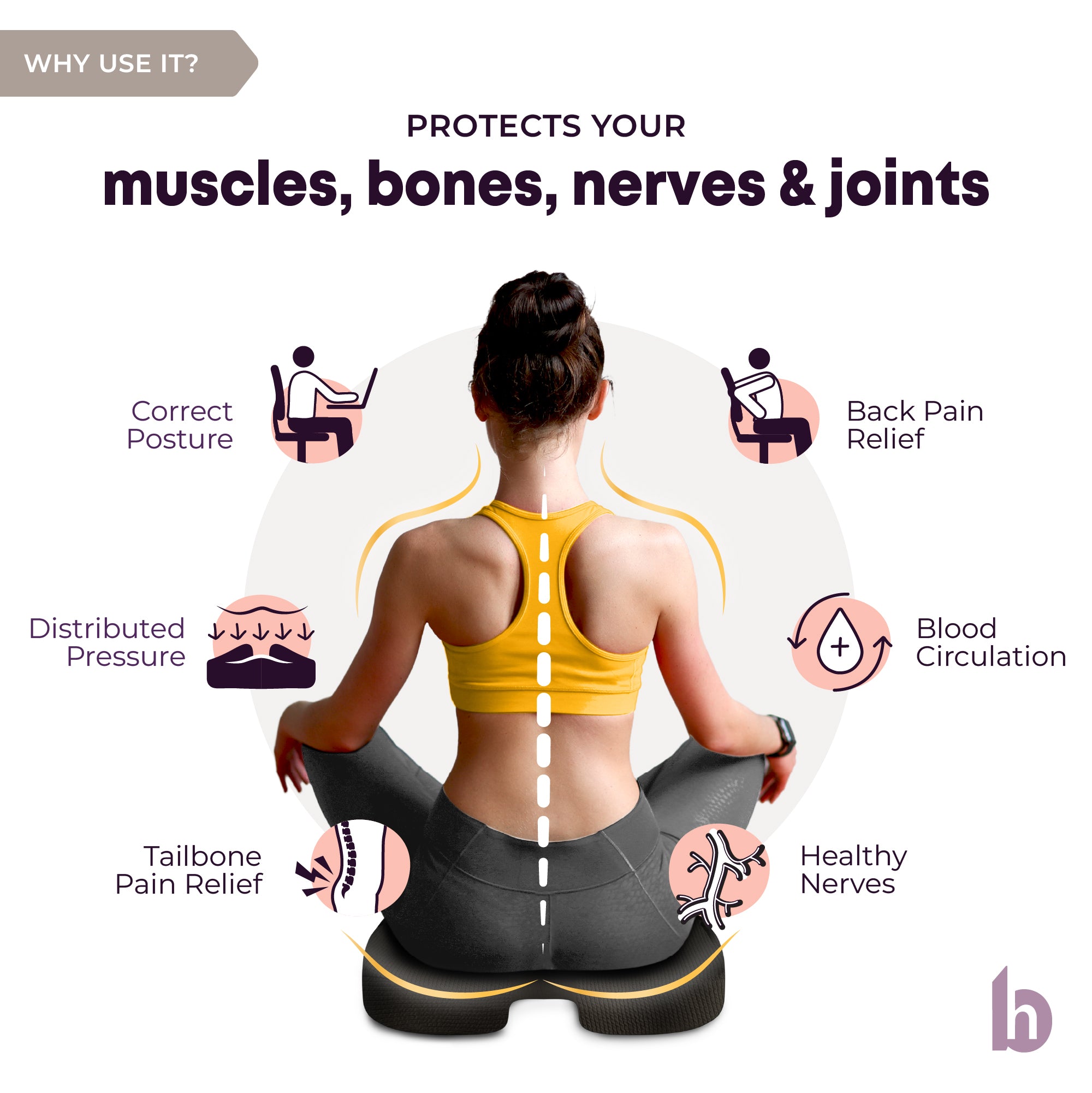 A coccyx cushion is designed to relieve pressure on the tailbone while sitting. Made with orthopedic-grade 100% pure memory foam, it offers firm yet comfortable support that doesn’t flatten out, promoting proper posture and reducing pain in the lower back and tailbone.