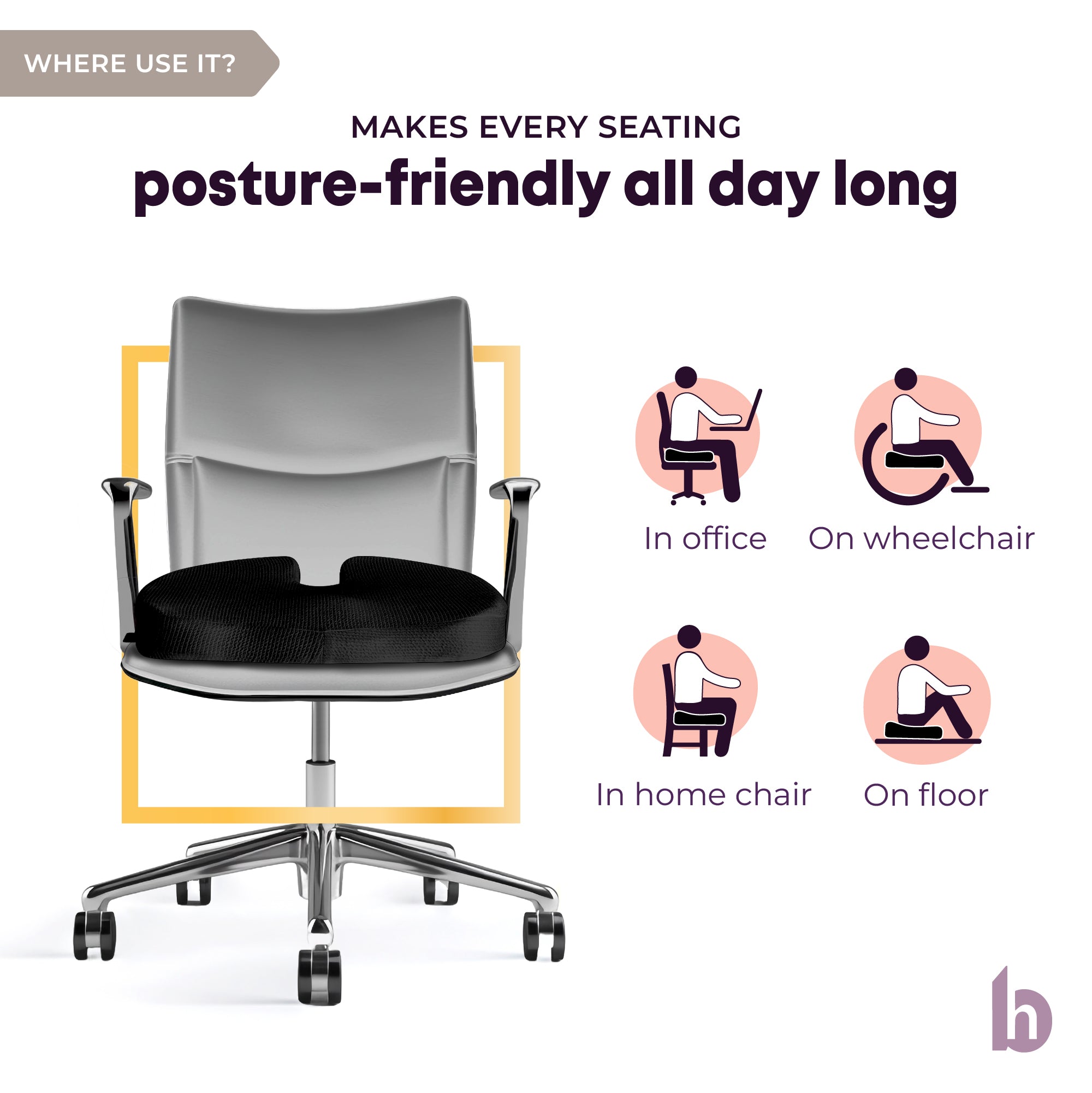 A coccyx cushion is designed to relieve pressure on the tailbone while sitting. Made with orthopedic-grade 100% pure memory foam, it offers firm yet comfortable support that doesn’t flatten out, promoting proper posture and reducing pain in the lower back and tailbone.